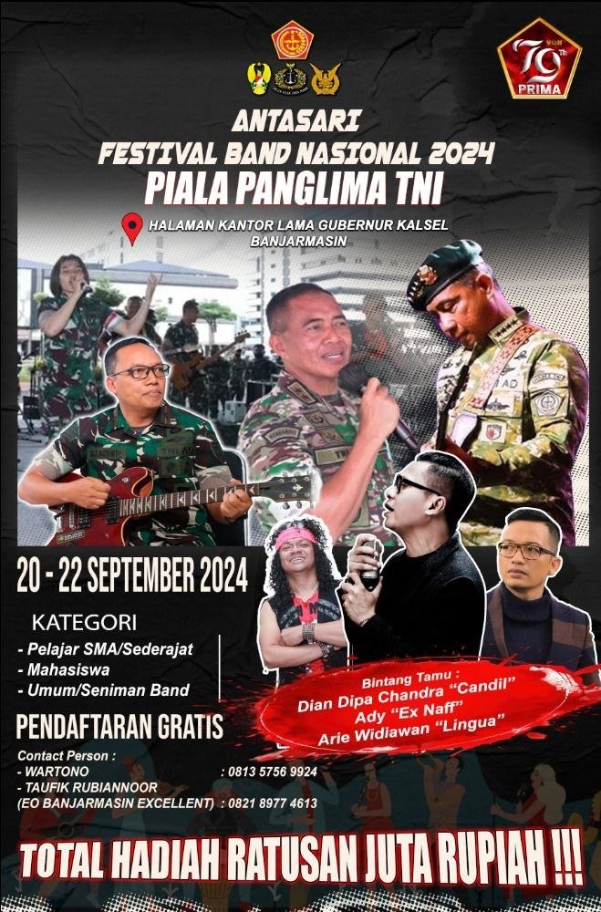 Antasari Festival Band Nasional 2024 Piala Panglima TNI akan dilaksanakan Komando Resor Militer (Korem) 101/Antasari, di kantor Gubernur Kalimantan Selatan lama, di Banjarmasin.