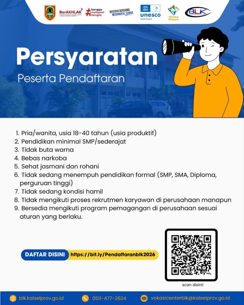 Pendaftaran dilakukan secara daring melalui laman https://bit.ly/Pendaftaranblk2026. Informasi terbaru juga dapat diakses melalui akun Instagram resmi BLK Kalsel di https://www.instagram.com/blk_banjarbaru_prov_kalsel/.