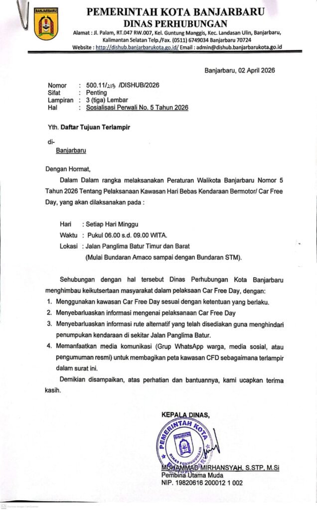 Banua Tv, Banjarbaru – Pemerintah Kota Banjarbaru melalui Dinas Perhubungan resmi mengumumkan perubahan lokasi pelaksanaan Car Free Day (CFD). Mulai 12 April 2026, kegiatan rutin mingguan tersebut akan dipindahkan dari kawasan Lapangan dr Murdjani ke sepanjang Jalan Panglima Batur.