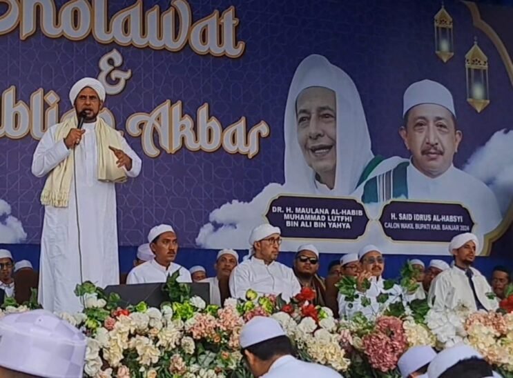 Habib Ali Zainal Abidin bin Segaf Assegaf dan Habib Achmad Jamal bin Thoha Ba’agil yang memimpin Tabligh Akbar dan Sholawat bersama itu mendoakan hajat pasangan calon bupati dan wabup Banjar itu dikabulkan oleh Allah SWT.