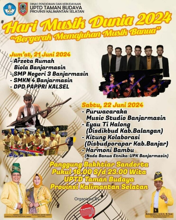Dalam rangka memperingati hari musik se dunia, Pemerintah Provinsi Kalimantan Selatan melalui Pelaksana Teknis Daerah (UPTD) Taman Budaya Provinsi Kalimantan Selatan, akan menyelenggarakan konser musik.