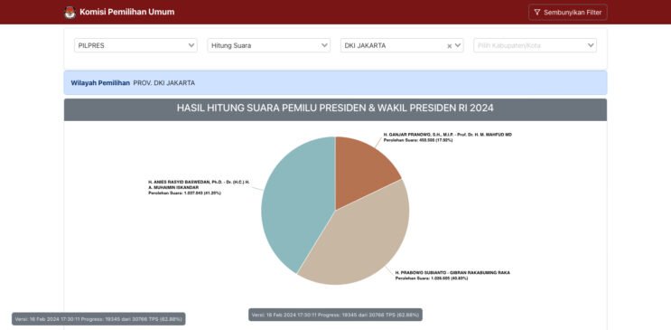 Hasil hitung suara Pemilu Presiden dan Wakil Presiden Republik Indonesia 2024 oleh Komisi Pemilihan Umum (KPU), untuk wilayah Provinsi DKI Jakarta hingga pukul 17.30 WIB, suara yang sudah masuk 62,88 persen atau 19.345 TPS dari total keseluruhan 30.766 TPS.