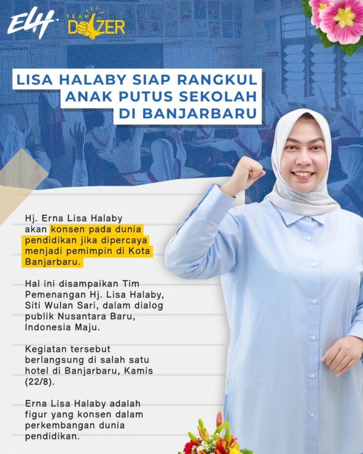 Bakal Calon Walikota Banjarbaru Hj Erna Lisa Halaby mengungkapkan akan konsen pada sektor pendidikan, dengan merangkul anak-anak yang putus sekolah.