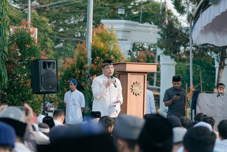 Waikota Banjarbaru Aditya Mufti Ariffin saat berikan sambutan pada pelaksanaan salat Idul Adha, yang dilaksanakan di Lapangan Murdjani Kota Banjarbaru. Foto: jongs/rdr/MedCenBJB