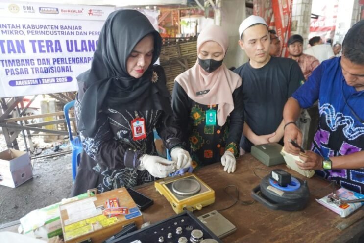 Tera ulang alat Ukur Takar, Timbang dan Peralatannya (UTTP), dilakukan Dinas Koperasi Usaha Mikro Perindustrian dan Perdagangan (DKUMPP) Kabupaten Banjar melalui Bidang Kemetrologian dan Bina Usaha, di Pasar Niaga Martapura, Kamis (27/2/2025) pagi.