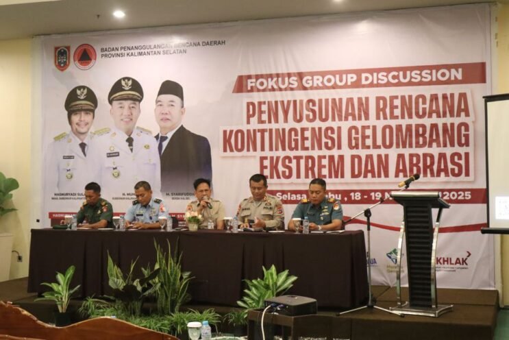 Banua Tv, Banjarbaru – Badan Penanggulangan Bencana Daerah (BPBD) Provinsi Kalimantan Selatan terus memperkuat kesiapsiagaan menghadapi potensi bencana pesisir melalui penyusunan Rencana Kontingensi (Renkon) Gelombang Ekstrem dan Abrasi Tahun 2025. Upaya tersebut dibahas dalam Focus Group Discussion (FGD) yang digelar di salah satu hotel di Banjarbaru, Selasa (18/11/2025).