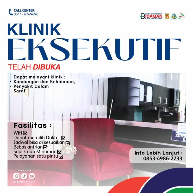 Untuk saat ini, Klinik Eksekutif RSD Idaman Banjarbaru membuka layanan spesialis Kandungan dan Kebidanan, Penyakit Dalam dan Saraf. Bagi masyarakat yang ingin mendaftar di Klinik Eksekutif dapat segera menghubungi nomor 0853-4986-2733.