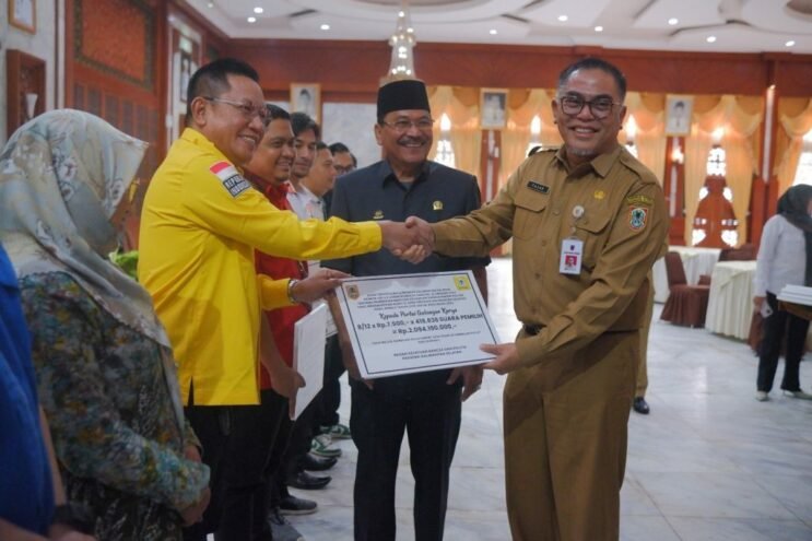 Pemerintah Provinsi Kalimantan Selatan serahkan bantuan keuangan partai politik (parpol) tahun anggaran 2024, Senin (01/04/2024) di Mahligai Pancasila Kediaman Gubernur Kalsel di Banjarmasin.