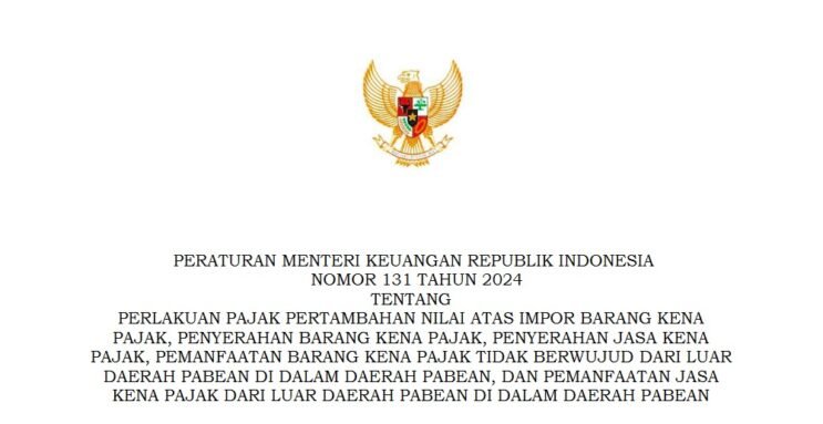 Dalam salinan PMK yang diterima pada Rabu (1/1/2025) dilansir dari infopublik.id disebutkan bahwa PMK 131 Tahun 2024 adalah PMK tentang Perlakuan Pajak Pertambahan Nilai atas Impor Barang Kena Pajak, Penyerahan Barang Kena Pajak, Penyerahan Jasa Kena Pajak, Pemanfaatan Barang Kena Pajak Tidak Berwujud dari Luar Daerah Pabean di Dalam Daerah Pabean, dan Pemanfaatan Jasa Kena Pajak dari Luar Daerah Pabean di Dalam Daerah Pabean.