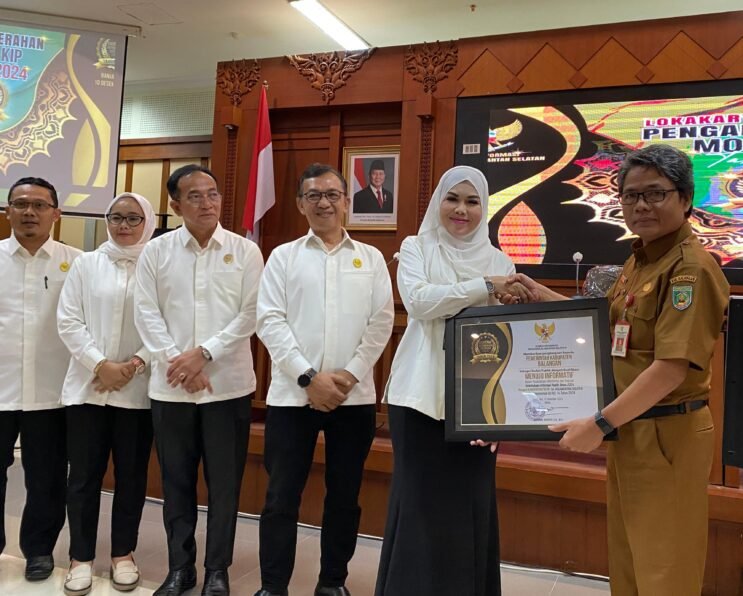 Ketua Komisi Informasi Provinsi Kalimantan Selatan, Nawang Wijayati, serahkan penghargaan kepada Kepala Dinas Komunikasi, Informatika, Statistik, dan Persandian (Diskominfosan) Kabupaten Balangan, M Nor, di Kantor Setda Kalsel, Banjarbaru, Selasa (10/12/2024).